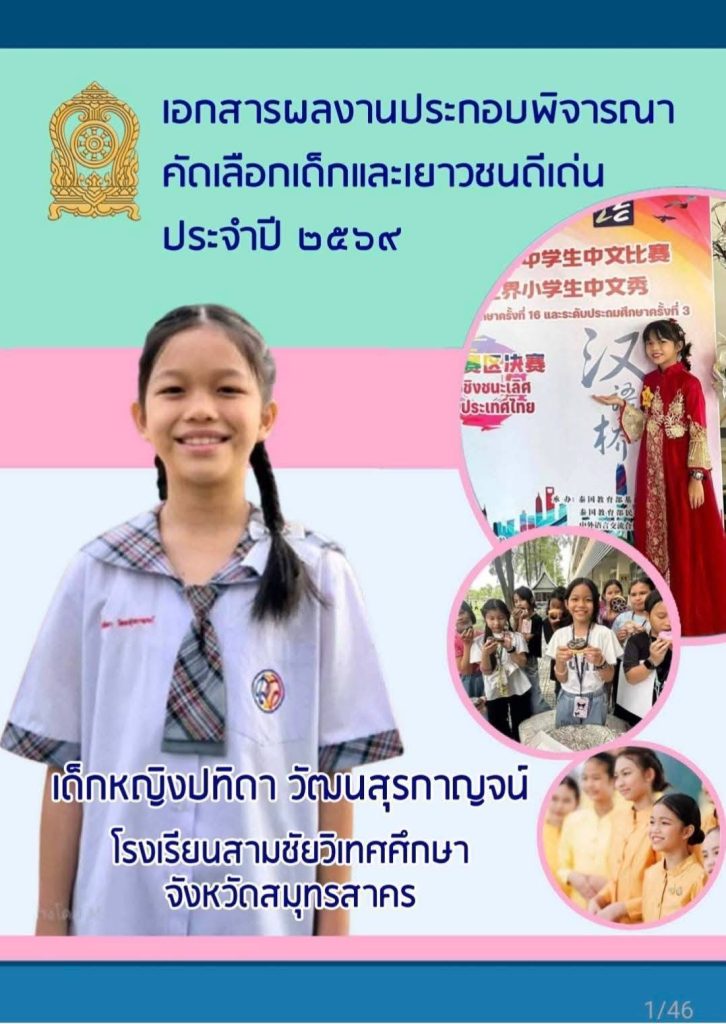 โรงเรียนสามชัยวิเทศศึกษา ขอแสดงความยินดีกับ เด็กหญิงปทิดา วัฒนสุรกาญจน์ นักเรียนชั้นประถมศึกษาปีที่ 5/2 ได้รับรางวัลชนะเลิศเด็กและเยาวชนดีเด่นระดับจังหวัดสมุทรสาคร เข้าแข่งขันระดับประเทศ ได้เข้ารับโล่เกียรติยศจากรัฐมนตรีว่าการกระทรวงศึกษาธิการ ในโอกาสวันเด็กแห่งชาติ เมื่อวันที่ 8 มกราคม 2569 ณ ทำเนียบรัฐบาล กรุงเทพมหานคร