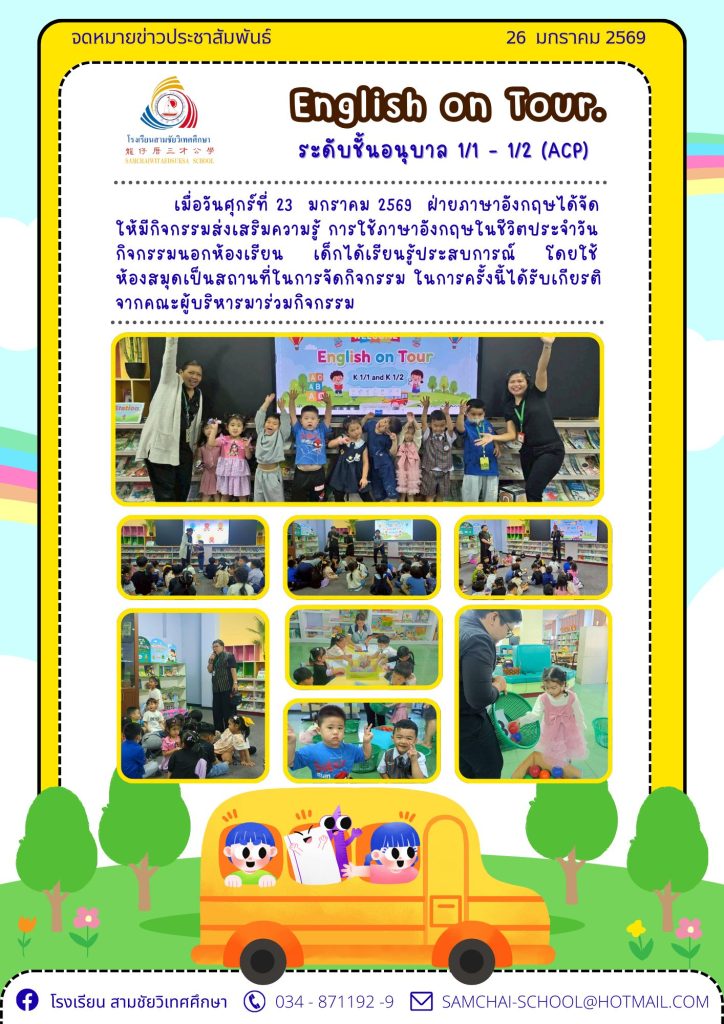 โรงเรียนสามชัยวิเทศศึกษา จัดกิจกรรม English On Tour สำหรับนักเรียนระดับชั้น อนุบาล 1 เพื่อส่งเสริมการเรียนรู้ภาษาอังกฤษผ่านประสบการณ์ตรงนอกห้องเรียน มุ่งเน้นการเรียนรู้จากสถานการณ์จริงควบคู่กับความสนุกสนาน เหมาะสมกับพัฒนาการของเด็กปฐมวัย