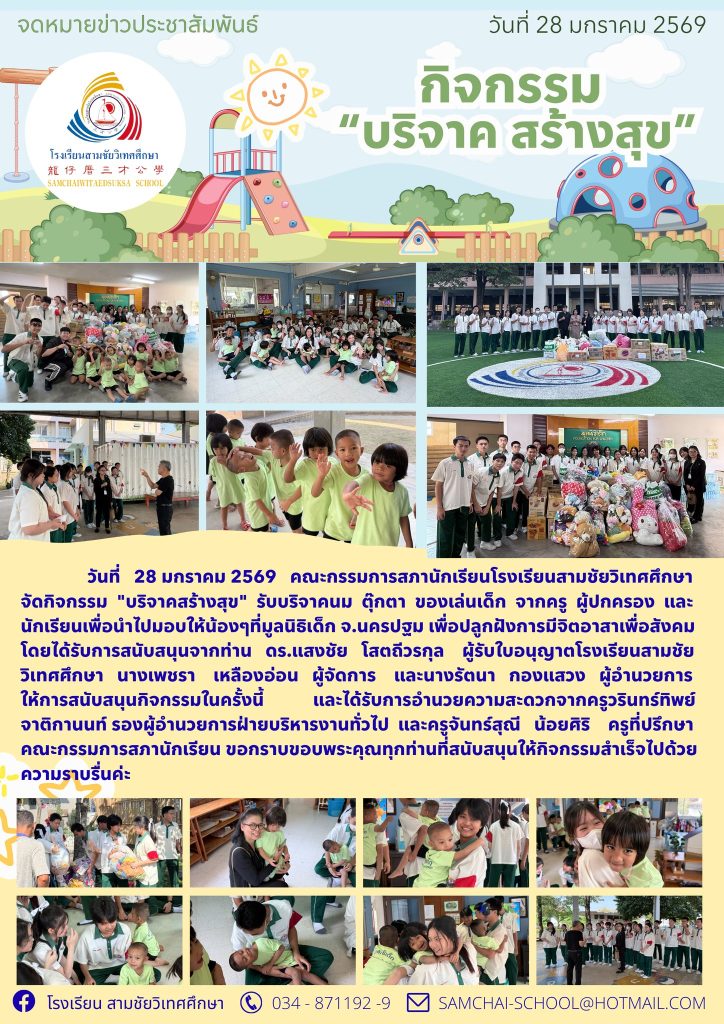 โรงเรียนสามชัยวิเทศศึกษา ขอขอบคุณผู้ปกครอง นักเรียน และทุกภาคส่วนที่ร่วมสนับสนุนกิจกรรม “สร้างสุข” ในครั้งนี้ ซึ่งนับเป็นอีกหนึ่งกิจกรรมที่สะท้อนถึงการสร้างเยาวชนให้เป็นผู้มีน้ำใจ เอื้อเฟื้อเผื่อแผ่ และมีความรับผิดชอบต่อสังคม