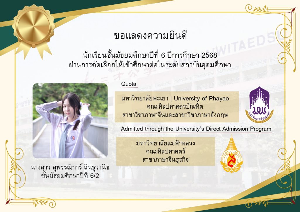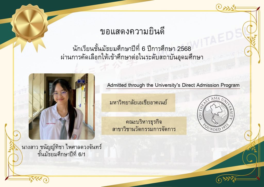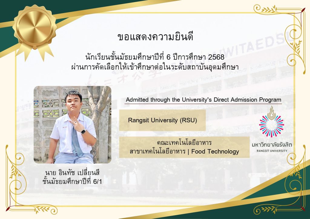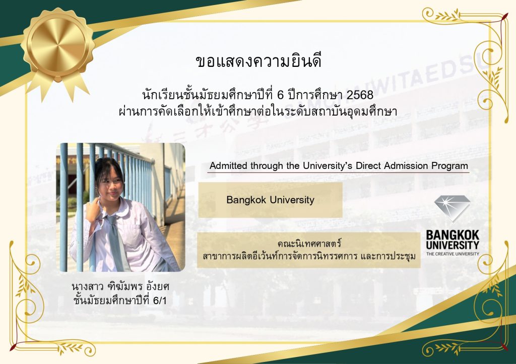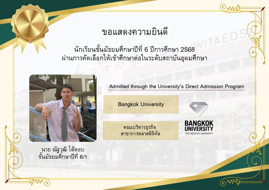 โรงเรียนขอแสดงความยินดีกับนักเรียนระดับชั้นมัธยมศึกษาปีที่ 6 ที่ผ่านการคัดเลือกและมีสิทธิ์เข้าศึกษาต่อในมหาวิทยาลัยชั้นนำของประเทศ ประจำปีการศึกษา 2569 นับเป็นอีกหนึ่งความภาคภูมิใจของนักเรียน ผู้ปกครอง และคณะครู ที่ได้ร่วมกันผลักดันและสนับสนุนจนประสบความสำเร็จตามเป้าหมาย