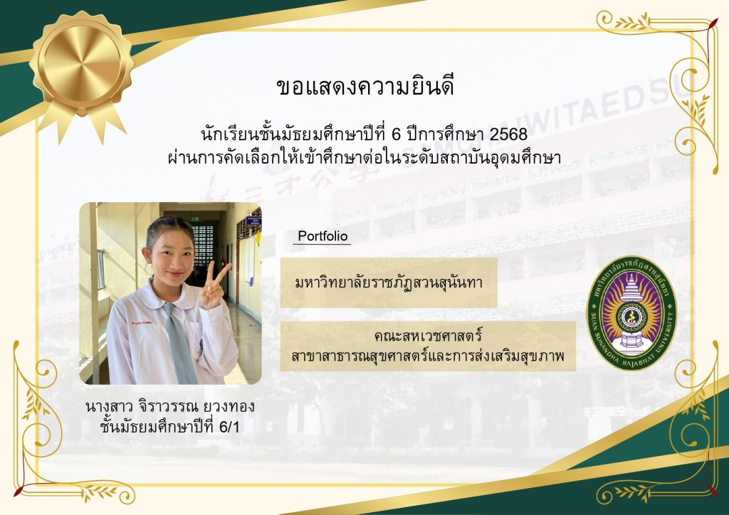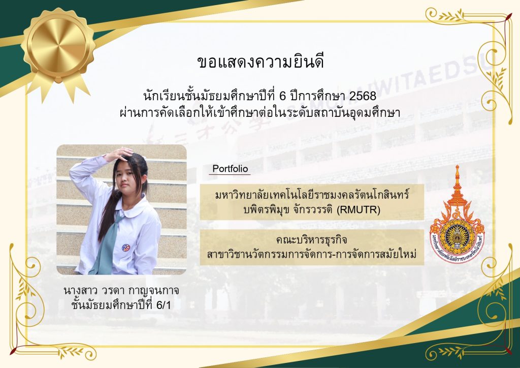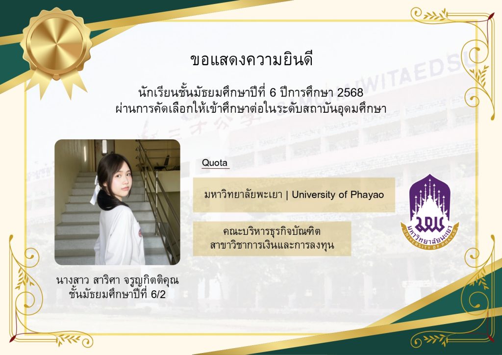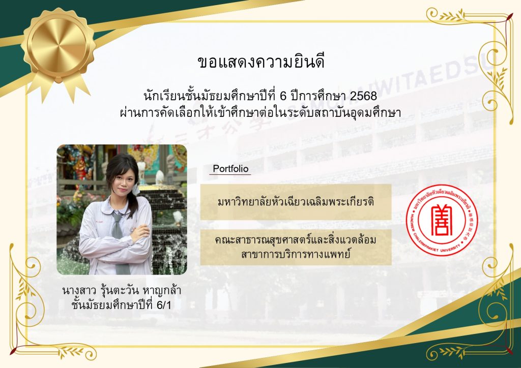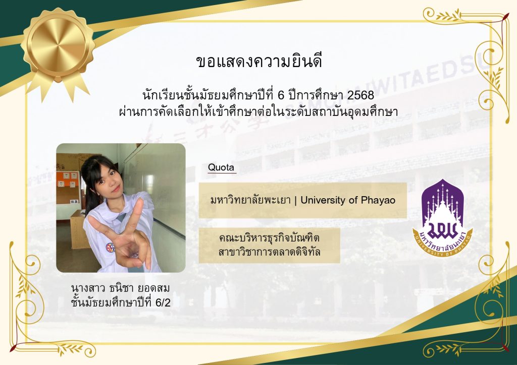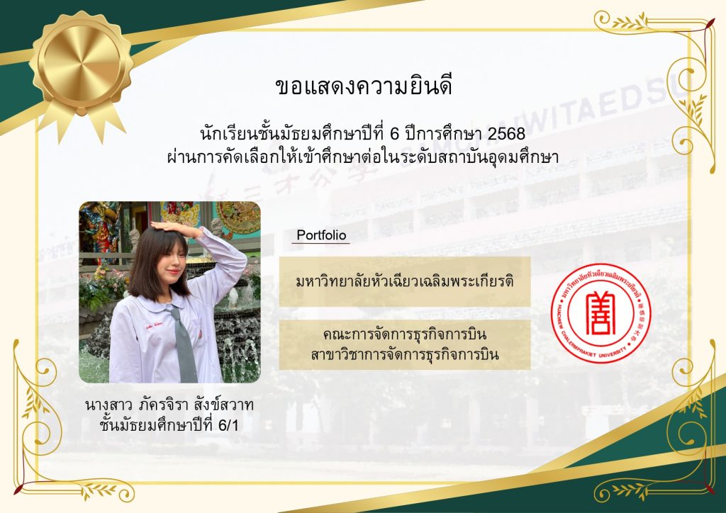 โรงเรียนขอแสดงความยินดีกับนักเรียนระดับชั้นมัธยมศึกษาปีที่ 6 ที่ผ่านการคัดเลือกและมีสิทธิ์เข้าศึกษาต่อในมหาวิทยาลัยชั้นนำของประเทศ ประจำปีการศึกษา 2569 นับเป็นอีกหนึ่งความภาคภูมิใจของนักเรียน ผู้ปกครอง และคณะครู ที่ได้ร่วมกันผลักดันและสนับสนุนจนประสบความสำเร็จตามเป้าหมาย