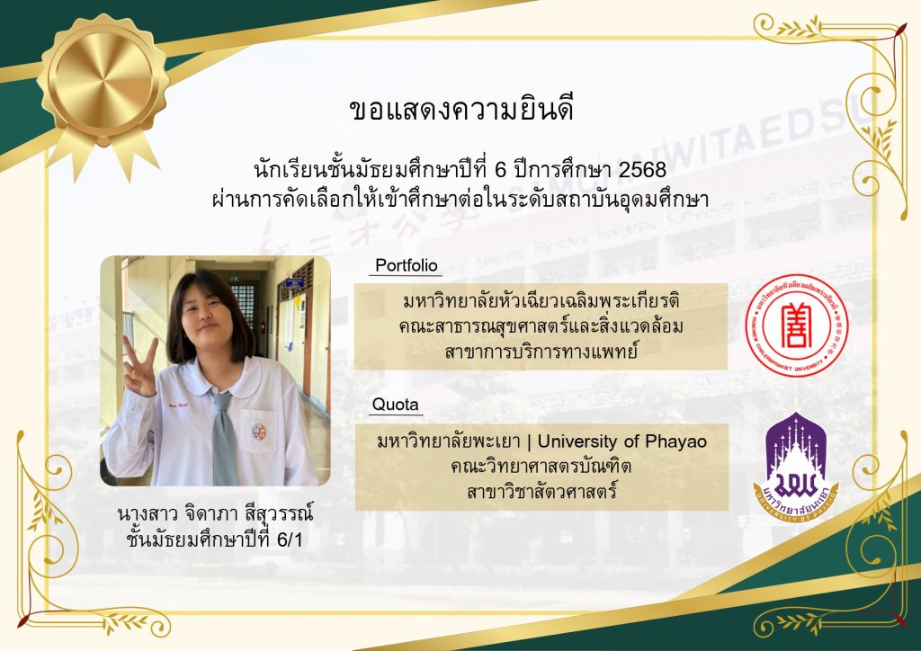 โรงเรียนขอแสดงความยินดีกับนักเรียนระดับชั้นมัธยมศึกษาปีที่ 6 ที่ผ่านการคัดเลือกและมีสิทธิ์เข้าศึกษาต่อในมหาวิทยาลัยชั้นนำของประเทศ ประจำปีการศึกษา 2569 นับเป็นอีกหนึ่งความภาคภูมิใจของนักเรียน ผู้ปกครอง และคณะครู ที่ได้ร่วมกันผลักดันและสนับสนุนจนประสบความสำเร็จตามเป้าหมาย